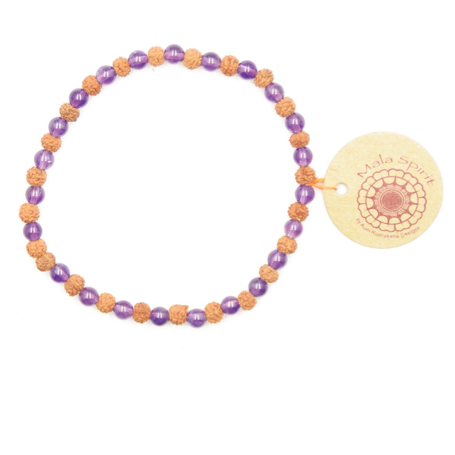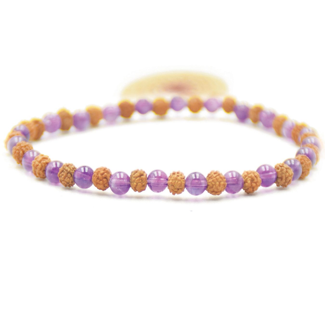 Rudraksha and amethyst mala bracelet, designed for mental calm and concentration during meditation.