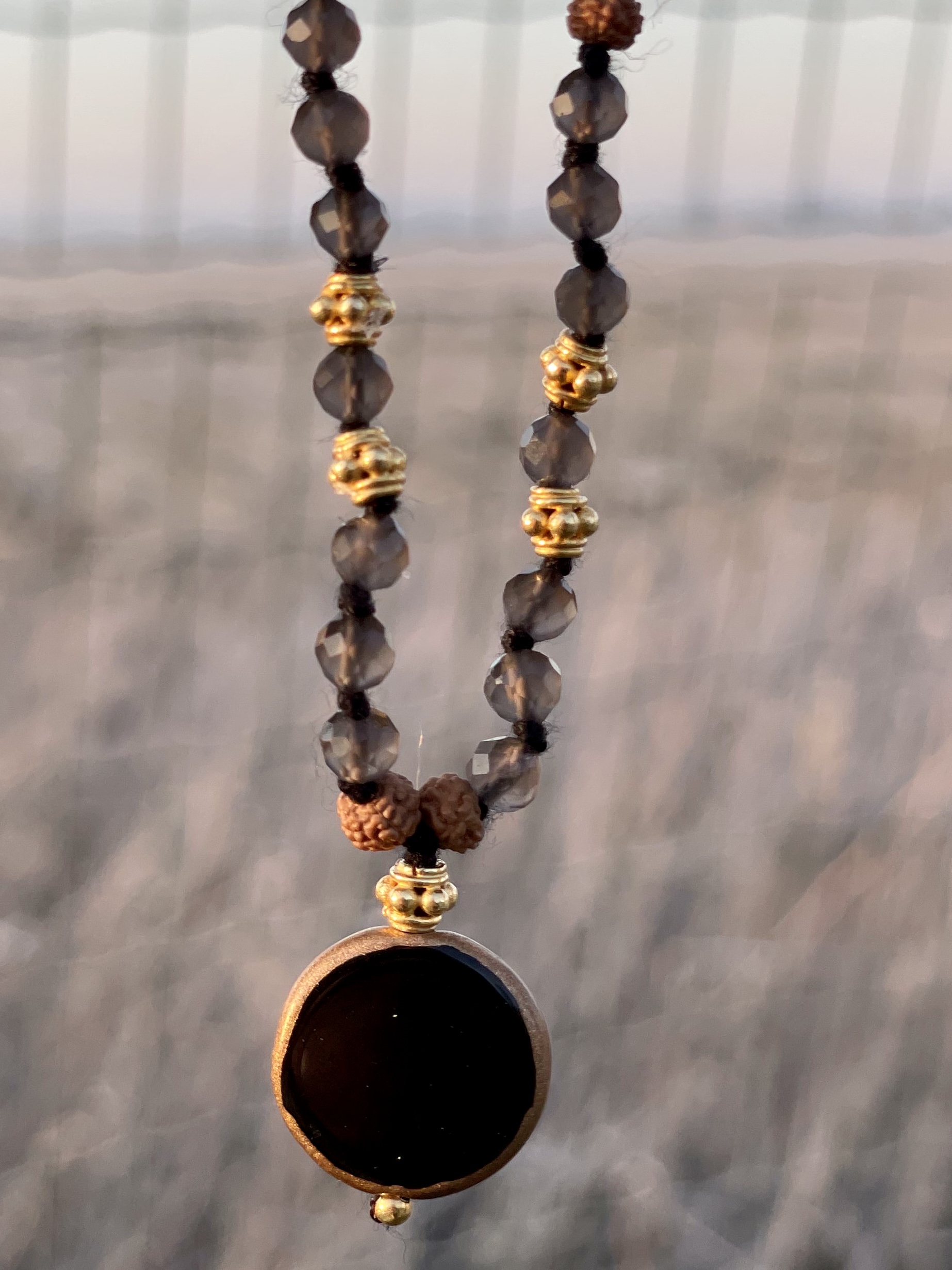 Mala Spirit Necklace with Obsidian, Smoky Quartz, and Rudraksha, handcrafted in limited edition, brings elegance and a subtle presence to your daily life.