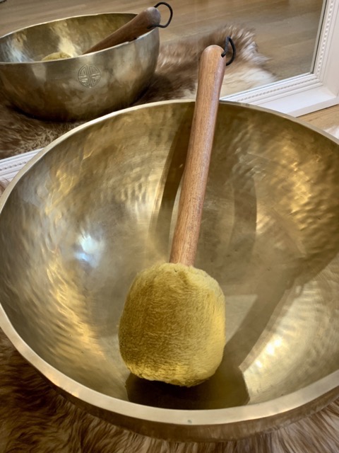 XXL Tibetan singing bowl, 43.5 cm, 8 kg, handmade in Nepal. With its deep and powerful sounds, it’s magnificent for sound healing while standing in the bowl or in a group setting.